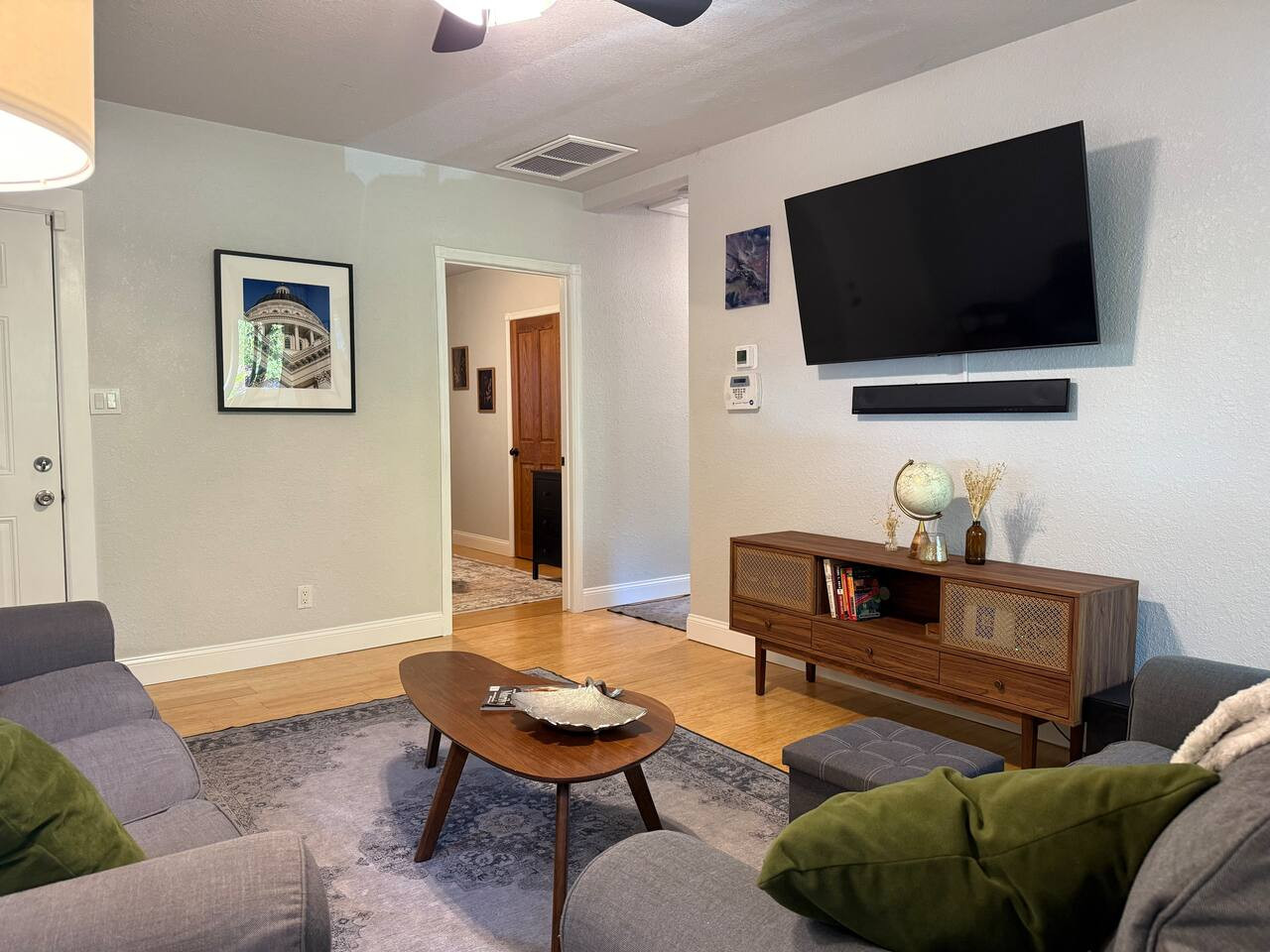 +1310-966-7446Welcome to your beautifully remodeled Sacramento retreat — a bright, modern home designed for style, comfort, and convenience. Every space has been freshly updated, featuring new finishes, contemporary furnishings, and thoughtful touches throughout. Whether you’re visiting for a weekend getaway, work trip, or extended stay, this home provides the clean, refreshed feel of a new build with the warmth of a lived-in space. Located in a quiet, tree-lined neighborhood, this fully remodeled home offers the perfect balance of relaxation and accessibility. Inside, you’ll find a bright open layout with a comfortable living room, new flooring throughout, and a smart TV for streaming your favorites. The modern kitchen features new stainless-steel appliances, updated cabinetry, and everything you need to prepare meals at home. Each of the three bedrooms has been thoughtfully remodeled with warm lighting, quality bedding, and contemporary finishes, providing a cozy retreat for up to six guests. Step outside to enjoy the private, fenced backyard — a peaceful spot for morning coffee, outdoor dining, or unwinding after a day of exploring Sacramento. The home also includes an in-unit washer and dryer for your convenience. Parking for one vehicle is available in the driveway, with additional free street parking nearby. Guests have full access to the entire property during their stay, including all indoor and outdoor spaces. Enjoy complete privacy throughout the home, from the bright, open living areas to the fully equipped kitchen and remodeled bedrooms. The fenced backyard is yours to relax in — perfect for outdoor meals, morning coffee, or quiet evenings under the trees. Guests also have use of the in-unit washer and dryer, and entry is simple and secure with a smart lock and personalized access code provided before arrival. We live about 15 minutes away. Message on the app first as it is monitored 24/7. The home has been fully remodeled from top to bottom, including new plumbing and electrical, for a clean, modern feel. Located in a quiet, established Sacramento neighborhood with tree-lined streets and easy access to downtown. Be sure to check out Old Soul for amazing, Fixins Soul Kitchen for great southern cooking, and The Butterscotch Den for cocktails. One small dog under 20 lbs is allowed for $100 pet fee.