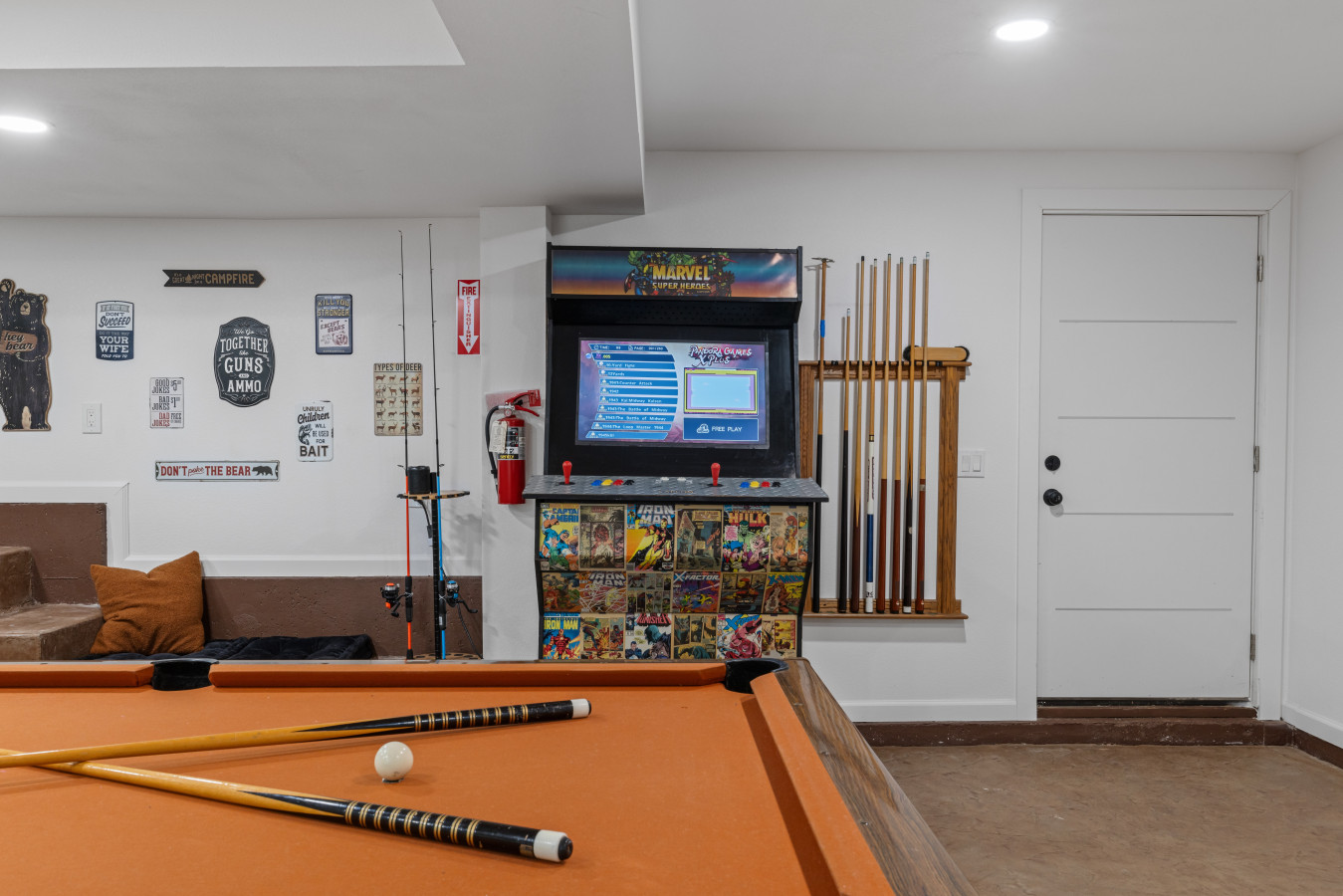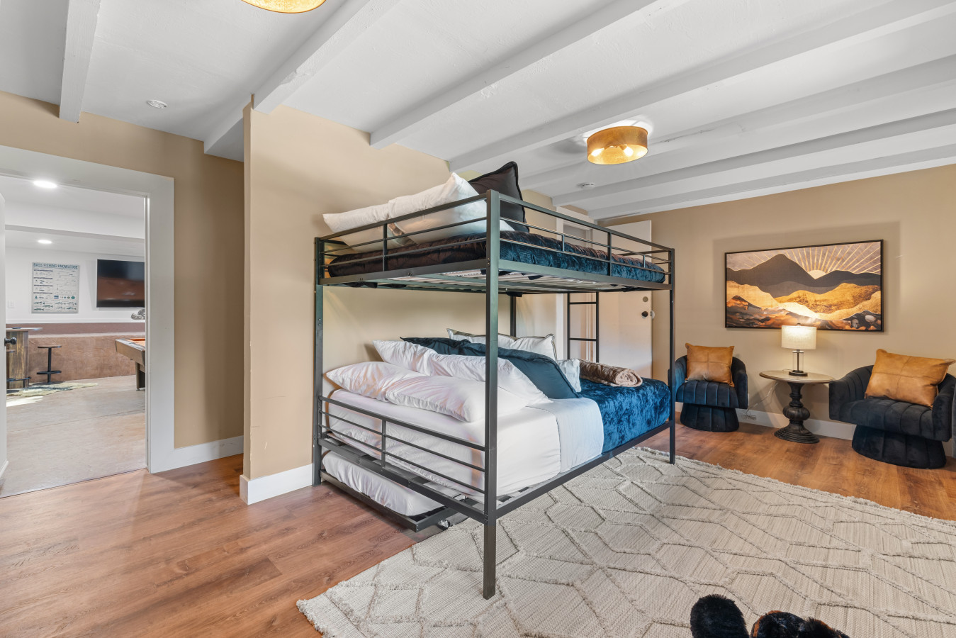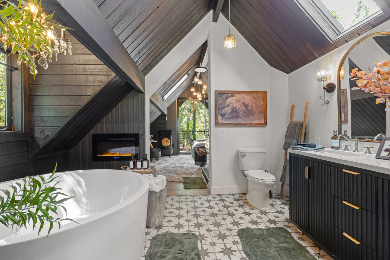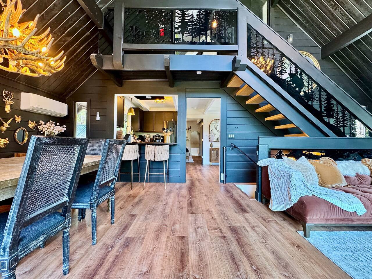 Updated 4BR/2BA in South Lake Tahoe. 2 gas fireplaces, arcade table (2,475 games), 5 Smart TVs. King master with private deck, bunk rooms for families. Granite kitchen, A/C, washer/dryer. Huge yard bordered by USFS land. Two decks, BBQ. 10 min to Hea...