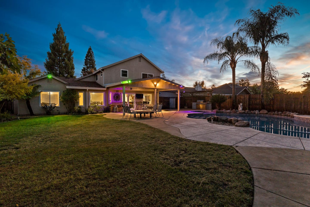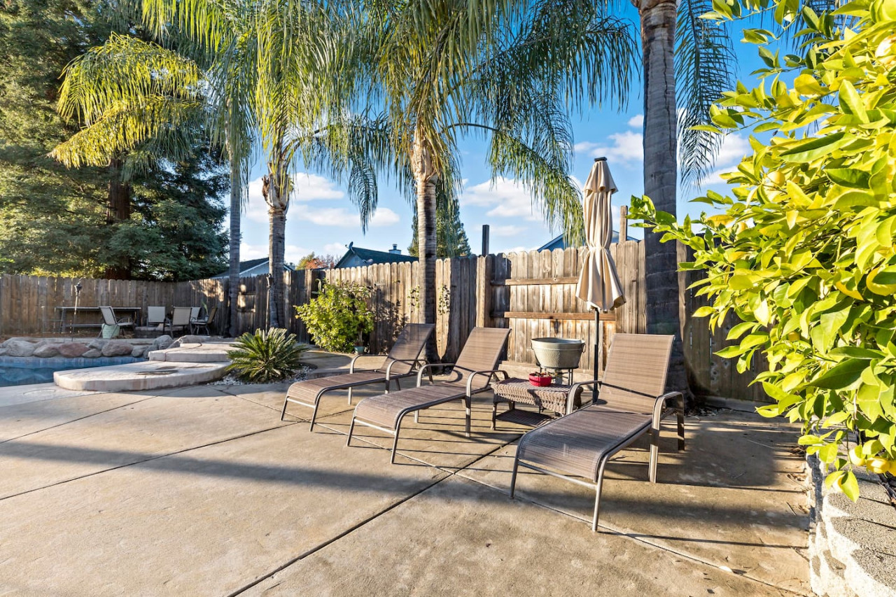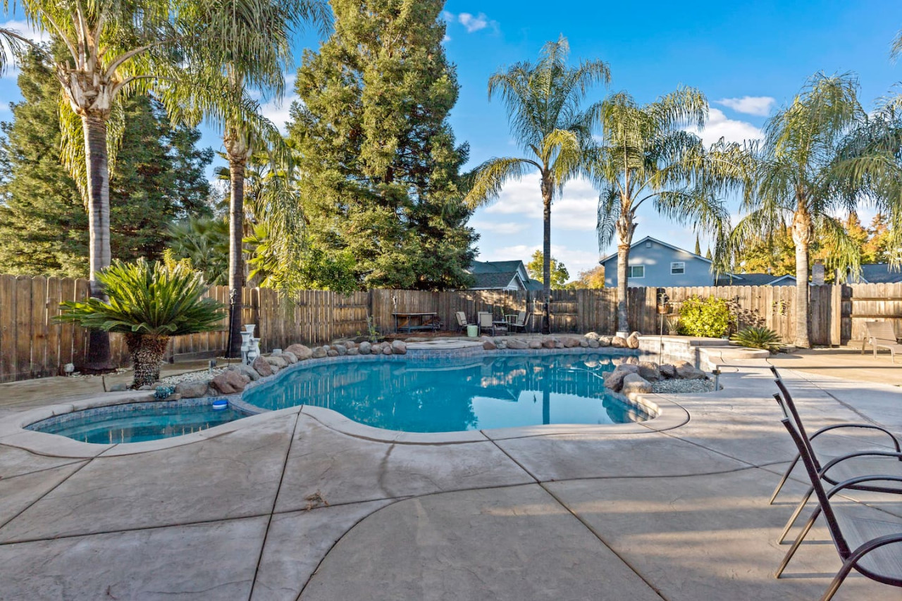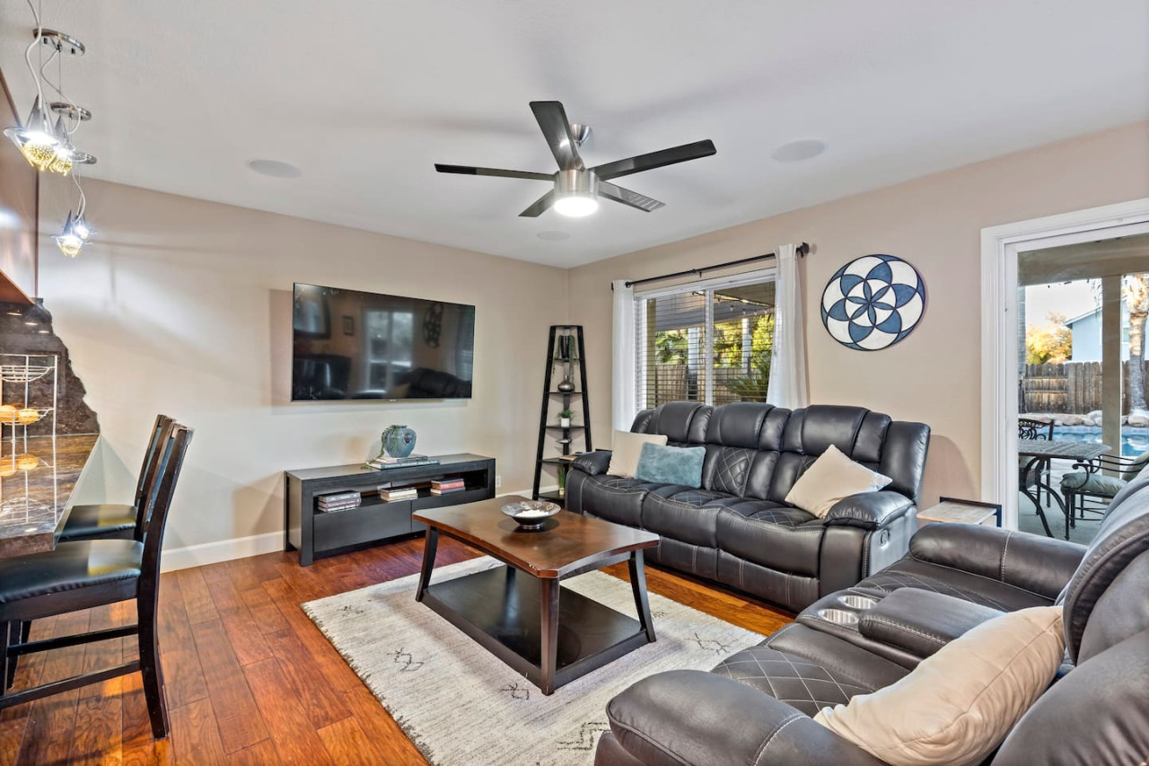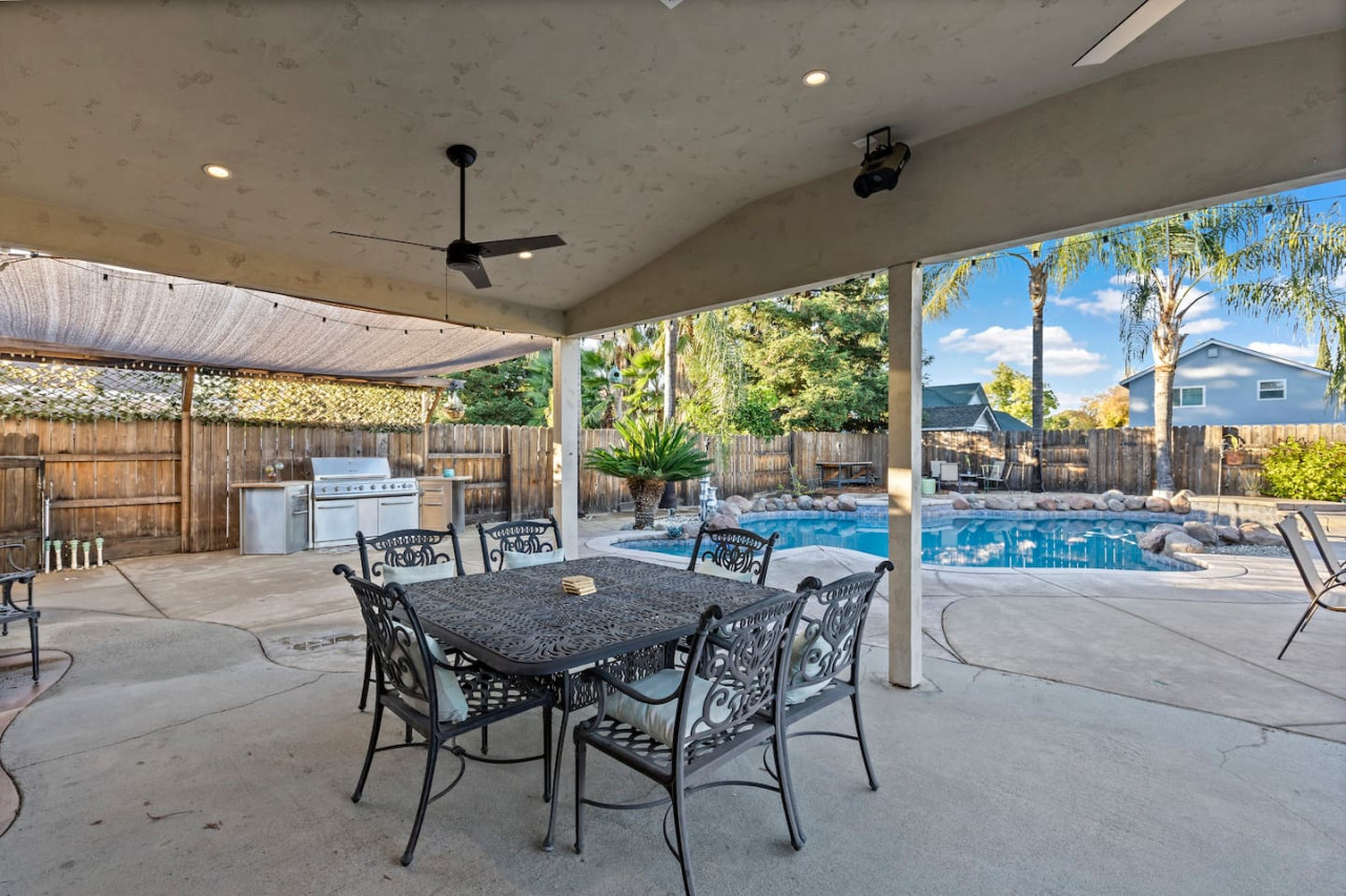 Single-story 4BR/3BA with private pool in Carmichael. King + 3 queens, fenced yard, garage, full kitchen, Smart TV, WiFi. Pool unheated. Pet-friendly. 20 min to Sacramento. Sleeps 8.