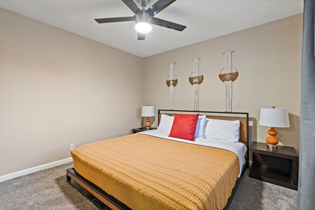 Spacious single-story 3BR/2BA in Rancho Cordova. King master with walk-in closet, 2 queens, granite island kitchen, fireplace, Smart TV. Covered patio with water feature, fenced yard, BBQ, garage parking. Pet-friendly. 20 min to Sacramento. 24/7 supp...