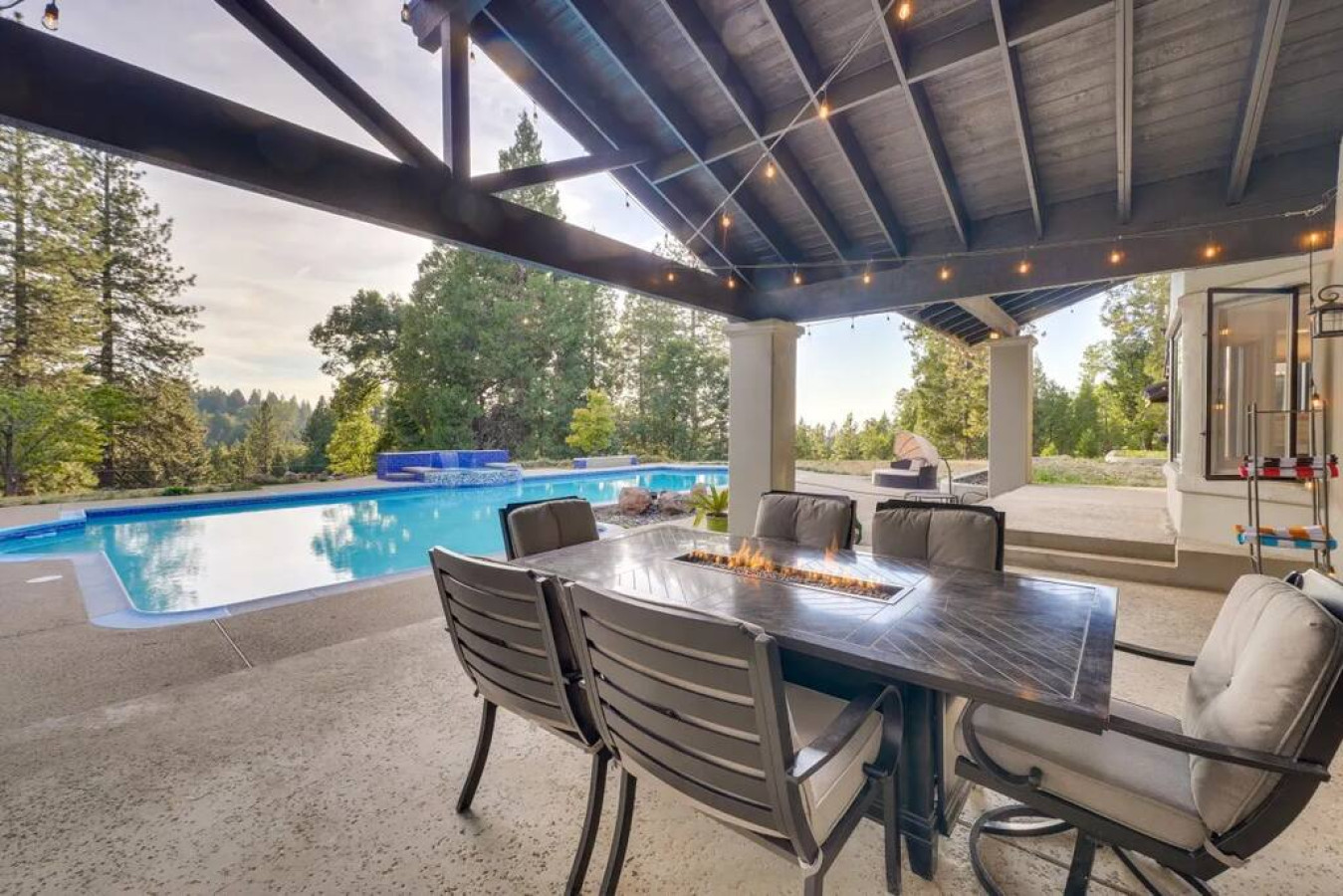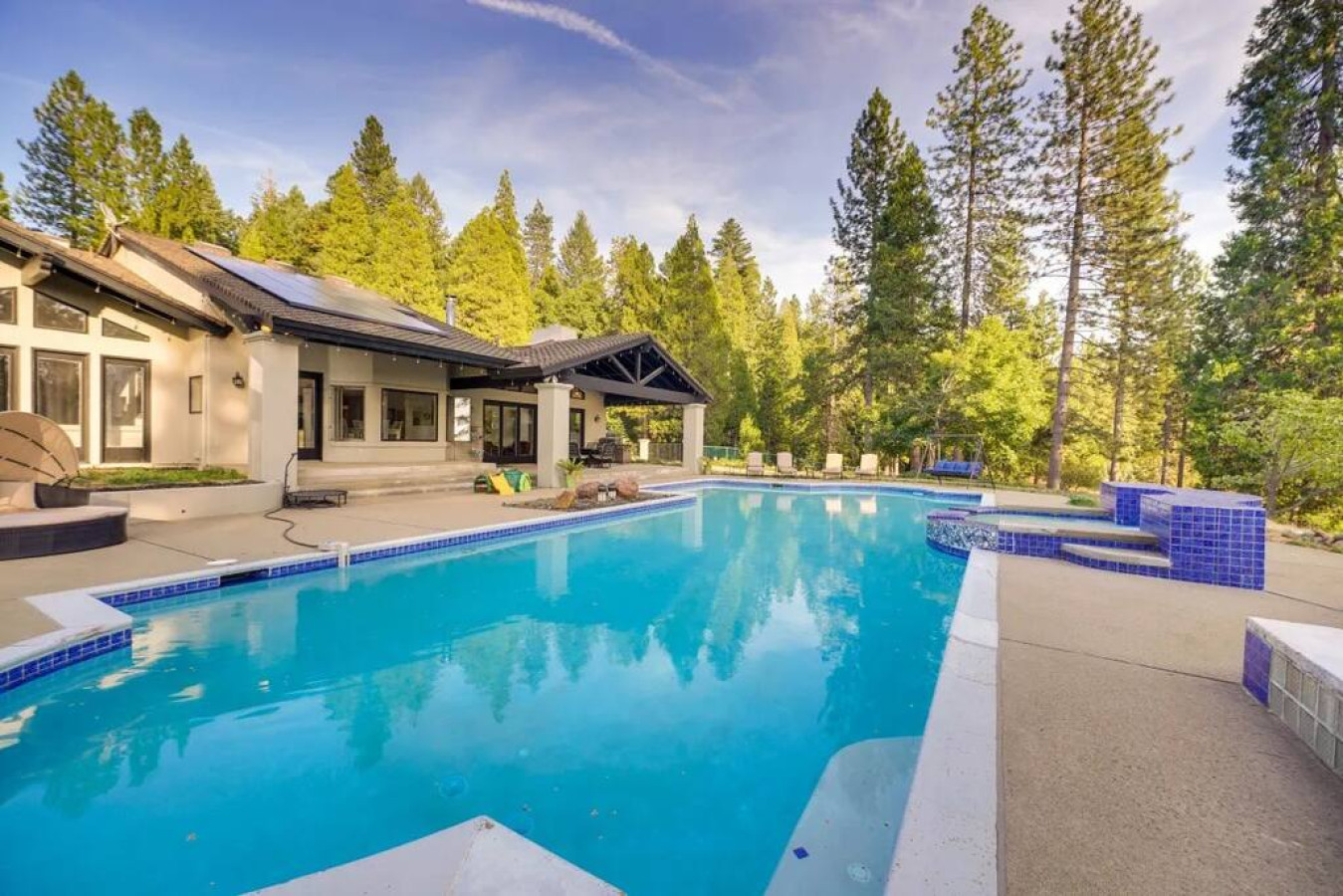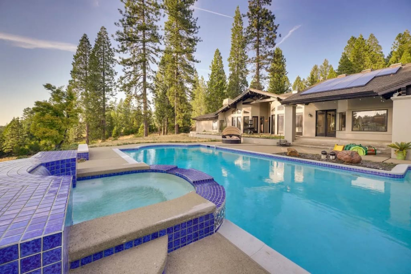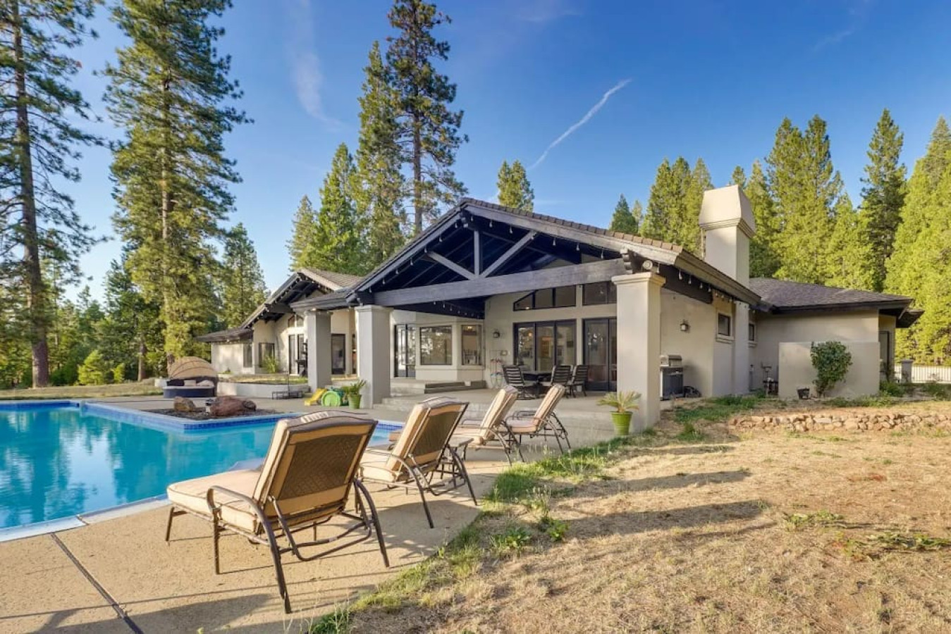 +1310-966-7446Bring the whole crew to this 5-bedroom, 4.5-bath mansion on nearly 6 private acres in the Sierra foothills. Swim in the 60-foot pool, soak in the built-in hot tub, or challenge everyone at pool and ping pong in the game room. Inside you'll find over 5,300 sqft of custom finishes — a marble kitchen with Sub Zero fridge, double ovens, wine fridge, and coffee bar; a wood-burning fireplace; Smart TVs; and 5 ensuite bedrooms so nobody shares a bathroom. The single-story layout means zero stairs. The kitchen is fully equipped: marble countertops, massive island, Sub Zero refrigerator, double ovens, blender, rice cooker, kettle, toaster, and coffee bar. Formal dining plus island seating. Bedrooms: Bedroom 1 has a king bed, Bedroom 2 has two twin beds, Bedrooms 3–5 each have a queen bed. All bedrooms have their own ensuite bathroom. Outside: 60-foot pool, built-in hot tub, covered patio, gas grill, hammock, and acres of fenced yard under towering pines. The game room features a pool table and ping pong table. Located 10 miles from Apple Hill's 50+ wineries and farms, 5 miles from Sly Park Recreation Area, and 45 minutes from South Lake Tahoe skiing. Three-car attached garage (fits vehicles up to 24 ft) plus driveway parking. Winter Access: The property has a long driveway that can be difficult to traverse when it snows. 4WD/AWD is strongly recommended November–March. We have a snow removal company servicing the driveway, but 4WD/AWD may still be necessary. Quiet hours are 10 PM – 8 AM per El Dorado County ordinance. No pool or hot tub use during quiet hours. Maximum occupancy: 10 guests. Pets allowed with prior approval and non-refundable fee (2 pet max). We're available 24/7 via messaging with a local team on standby for any issues. El Dorado County Vacation Home Rental Permit No. 075634. Transient Occupancy Tax Cert. 076624