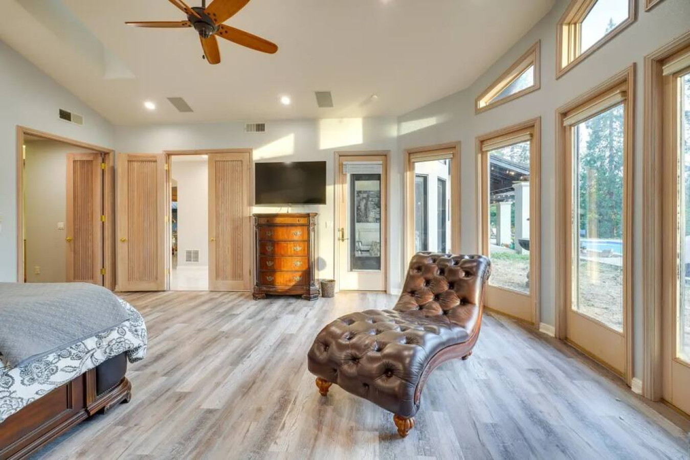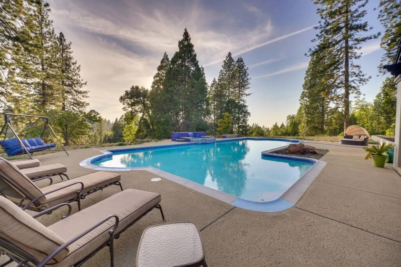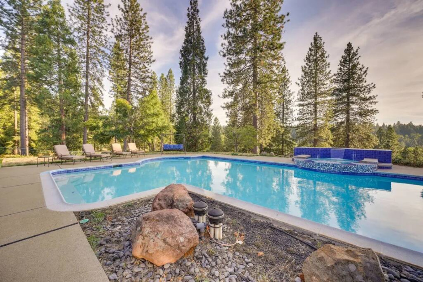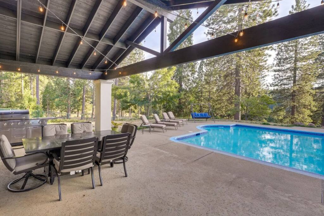 +1310-966-7446Bring the whole crew to this 5-bedroom, 4.5-bath mansion on nearly 6 private acres in the Sierra foothills. Swim in the 60-foot pool, soak in the built-in hot tub, or challenge everyone at pool and ping pong in the game room. Inside you'll find over 5,300 sqft of custom finishes — a marble kitchen with Sub Zero fridge, double ovens, wine fridge, and coffee bar; a wood-burning fireplace; Smart TVs; and 5 ensuite bedrooms so nobody shares a bathroom. The single-story layout means zero stairs. The kitchen is fully equipped: marble countertops, massive island, Sub Zero refrigerator, double ovens, blender, rice cooker, kettle, toaster, and coffee bar. Formal dining plus island seating. Bedrooms: Bedroom 1 has a king bed, Bedroom 2 has two twin beds, Bedrooms 3–5 each have a queen bed. All bedrooms have their own ensuite bathroom. Outside: 60-foot pool, built-in hot tub, covered patio, gas grill, hammock, and acres of fenced yard under towering pines. The game room features a pool table and ping pong table. Located 10 miles from Apple Hill's 50+ wineries and farms, 5 miles from Sly Park Recreation Area, and 45 minutes from South Lake Tahoe skiing. Three-car attached garage (fits vehicles up to 24 ft) plus driveway parking. Winter Access: The property has a long driveway that can be difficult to traverse when it snows. 4WD/AWD is strongly recommended November–March. We have a snow removal company servicing the driveway, but 4WD/AWD may still be necessary. Quiet hours are 10 PM – 8 AM per El Dorado County ordinance. No pool or hot tub use during quiet hours. Maximum occupancy: 10 guests. Pets allowed with prior approval and non-refundable fee (2 pet max). We're available 24/7 via messaging with a local team on standby for any issues. El Dorado County Vacation Home Rental Permit No. 075634. Transient Occupancy Tax Cert. 076624