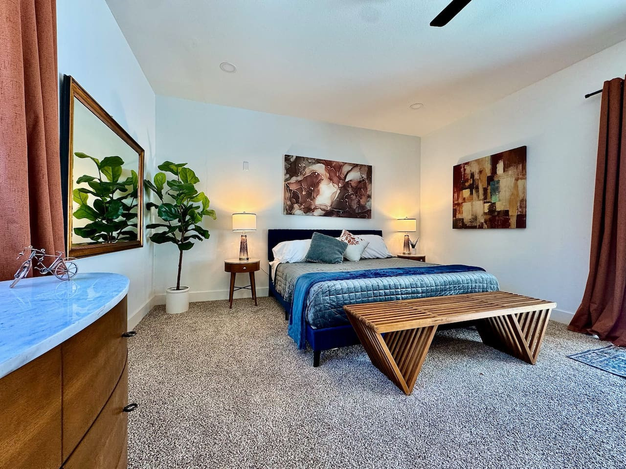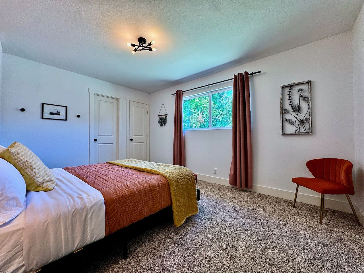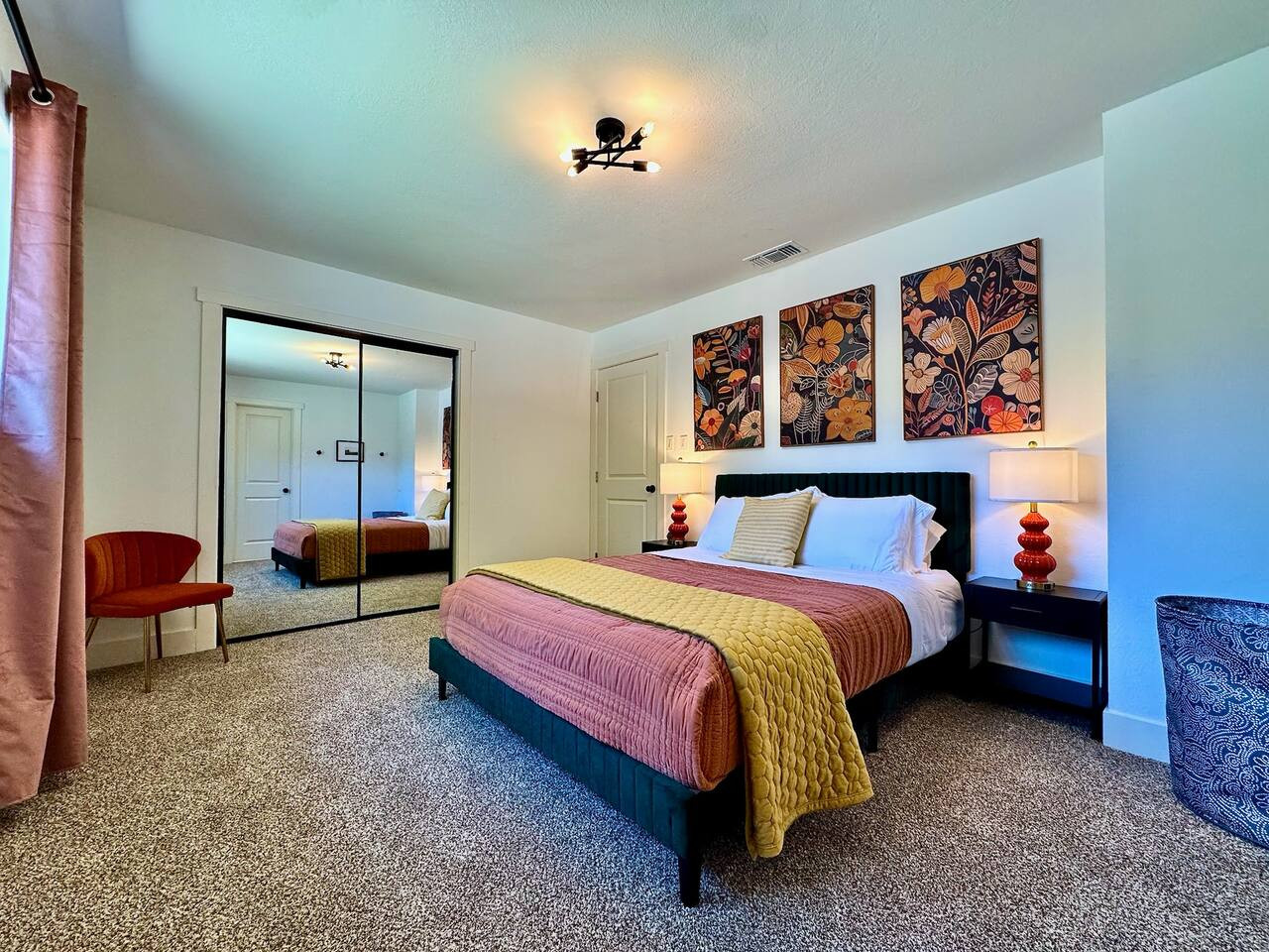 Charming mid-century modern home in a quiet West Sacramento neighborhood, just 5 minutes from downtown Sacramento. Upstairs: King bed with en-suite bathroom. Downstairs: 2 queen bedrooms with shared full bathroom. Fully stocked kitchen open to famil...