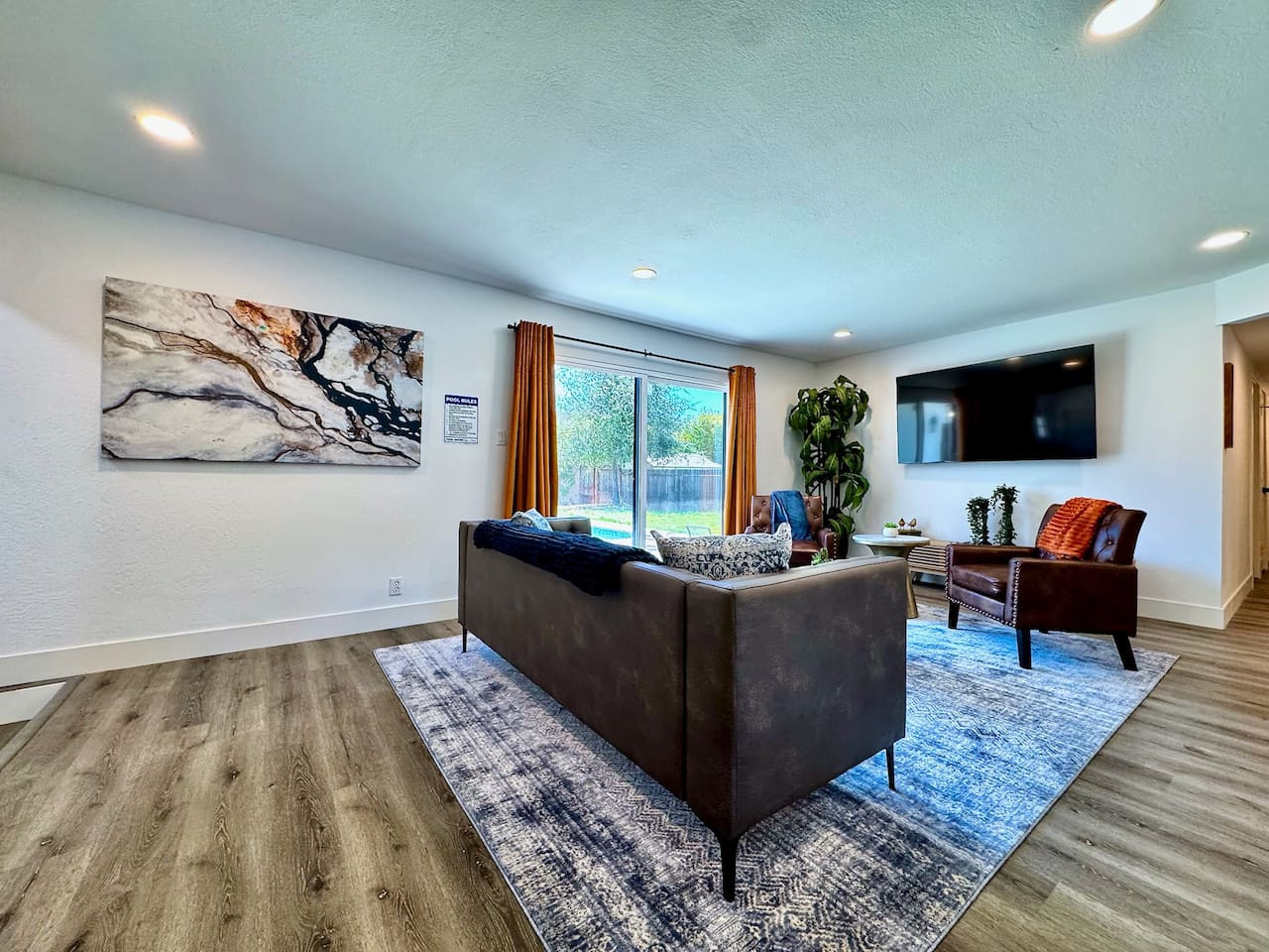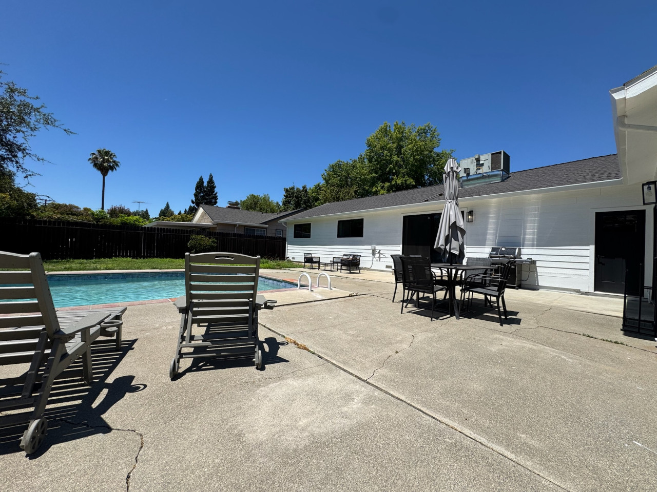 +1310-966-7446Single-story 4BR/3BA with private pool in Carmichael. King + 3 queens, fenced yard, garage, full kitchen, Smart TV, WiFi. Pool unheated. Pet-friendly. 20 min to Sacramento. Sleeps 8.