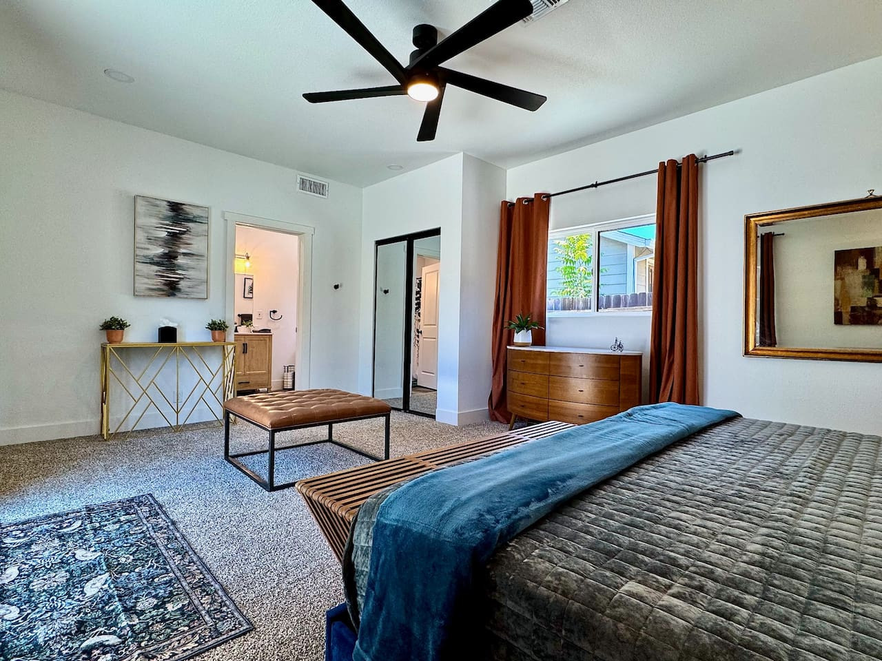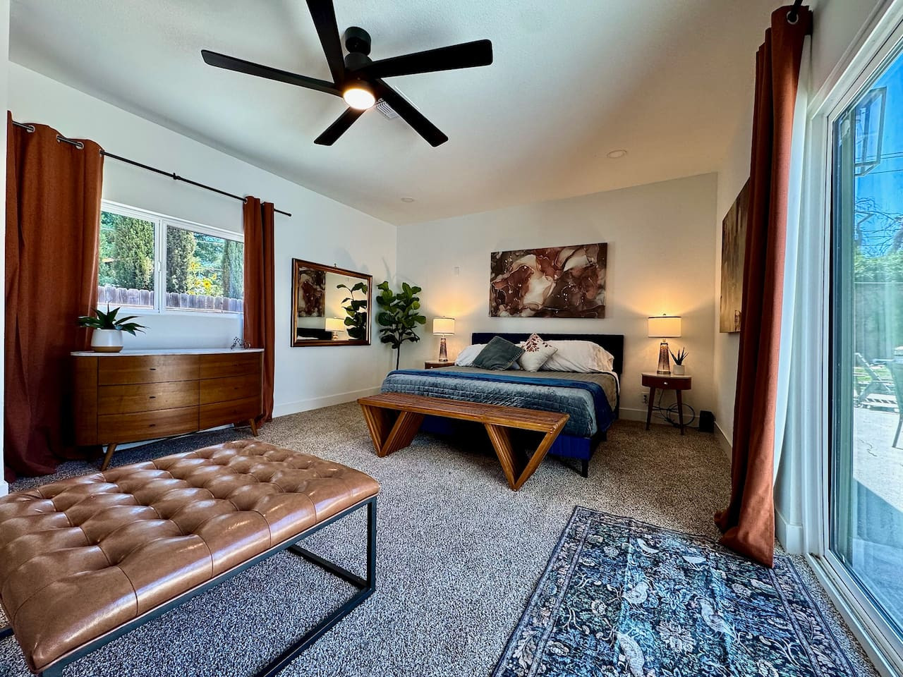 Private mid-century modern cottage in Carmichael. Cal King bed, kitchen, bathroom, walk-in closet, washer/dryer, TV. Private entrance and patio. 30-night min. Pet-friendly. 10.0 rating.