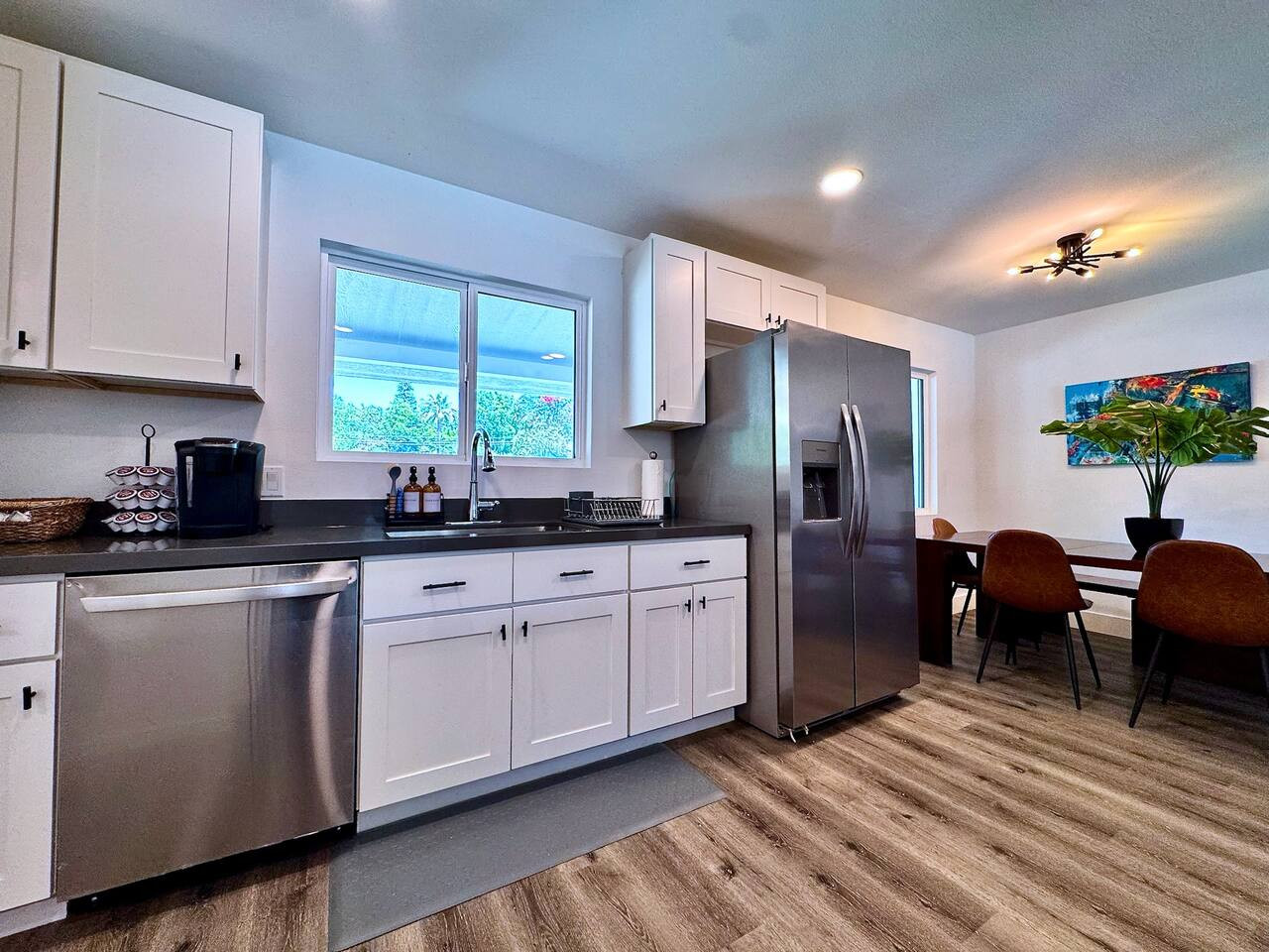 Built 2021. Modern 3BR/2BA in Rocklin. Granite counters, gas range, farmhouse sink, stainless appliances, breakfast bar. King + 2 queens. Smart TV, WiFi, AC, detached garage. Near Roseville and Granite Bay. Pet-friendly. 25 min to Sacramento. 24/7 su...