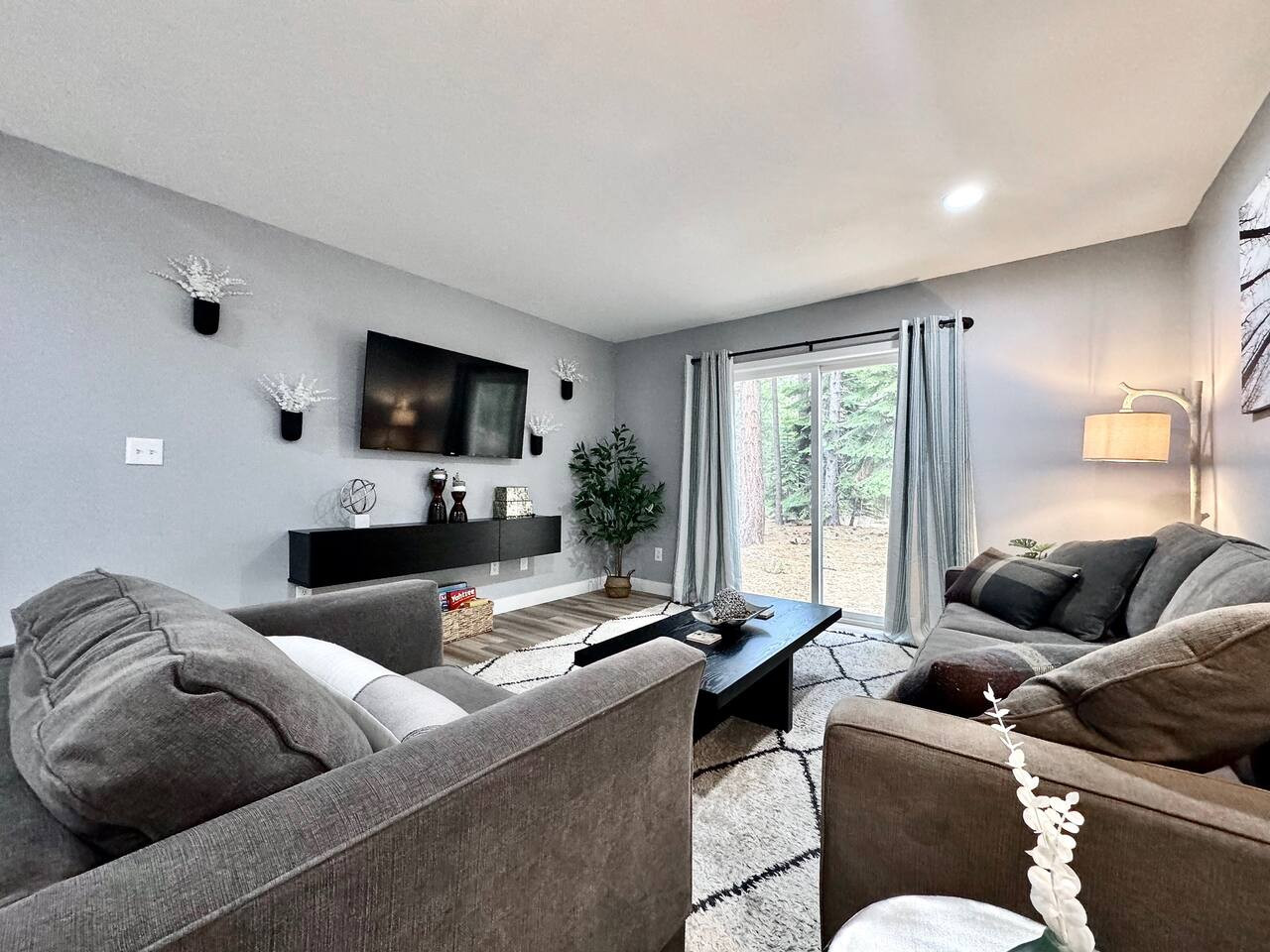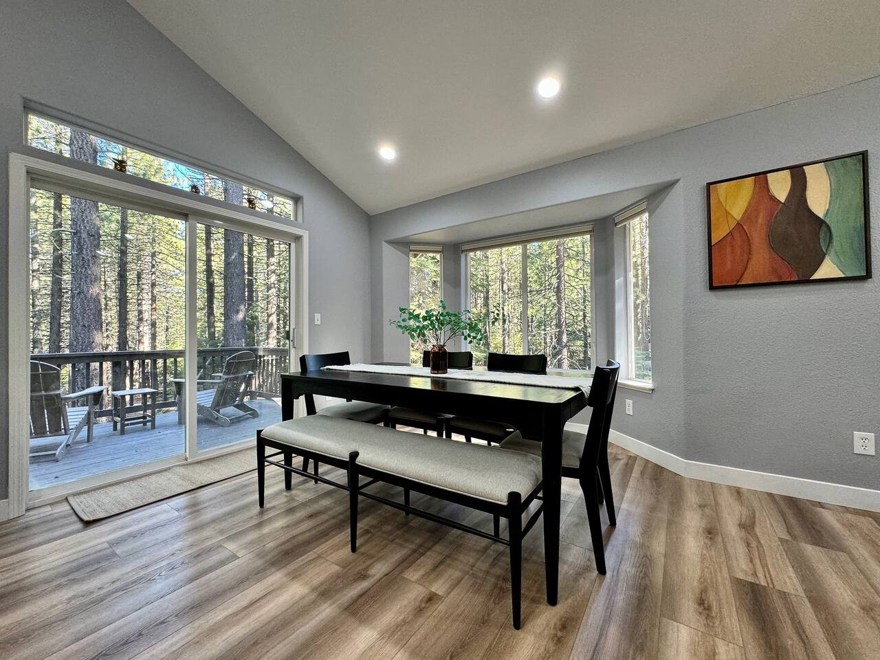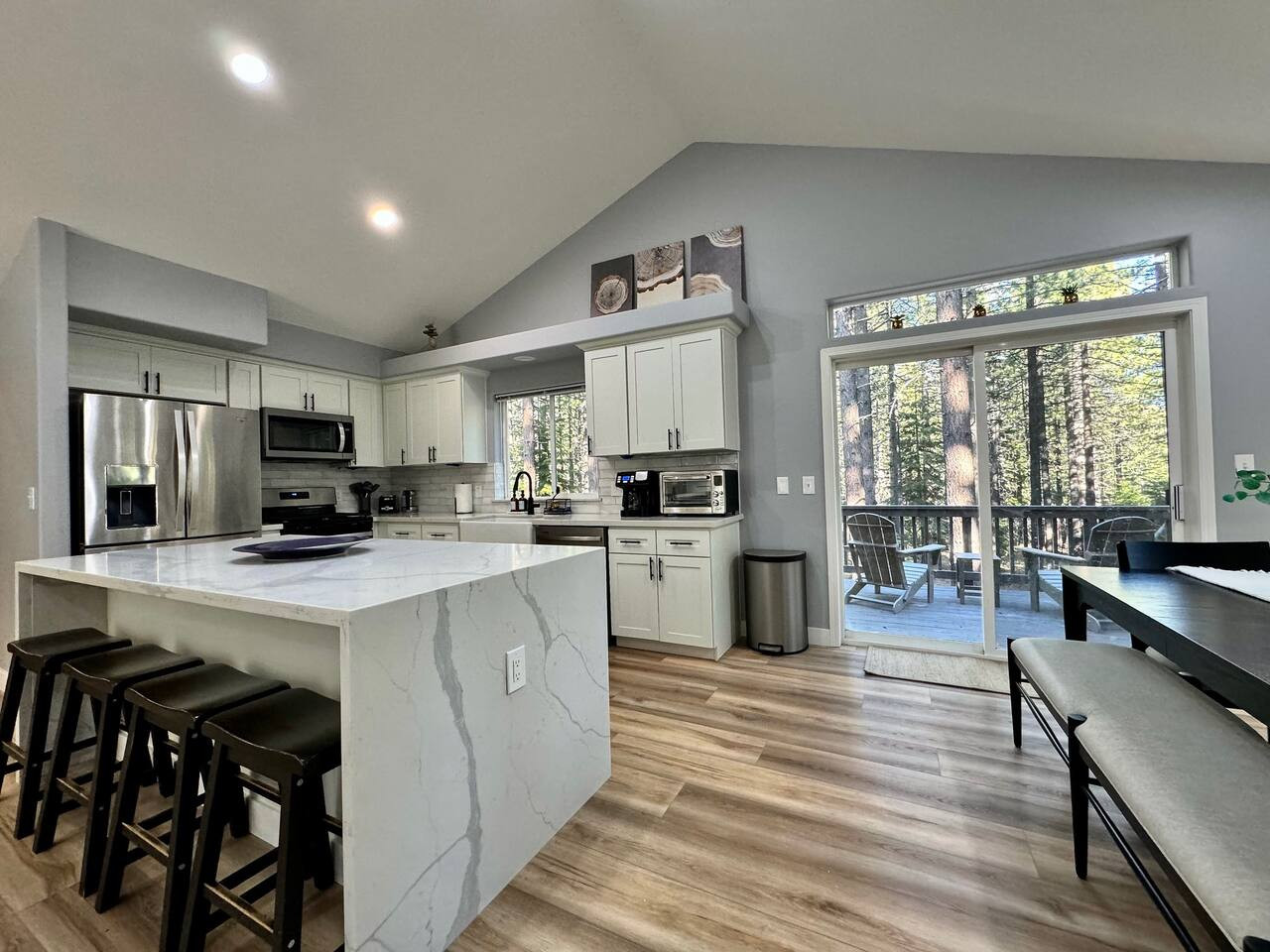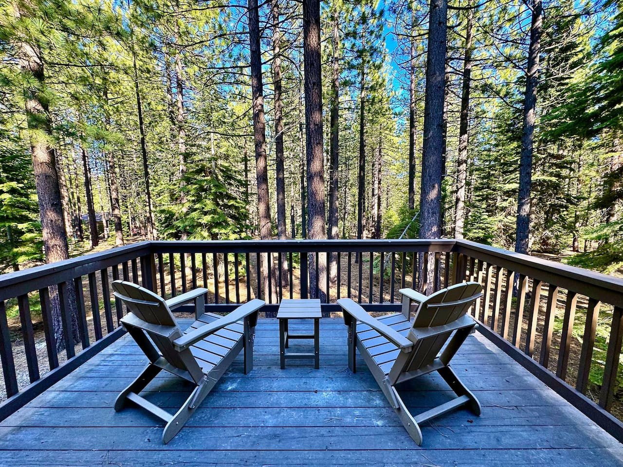 Updated 4BR/2BA in South Lake Tahoe. 2 gas fireplaces, arcade table (2,475 games), 5 Smart TVs. King master with private deck, bunk rooms for families. Granite kitchen, A/C, washer/dryer. Huge yard bordered by USFS land. Two decks, BBQ. 10 min to Hea...