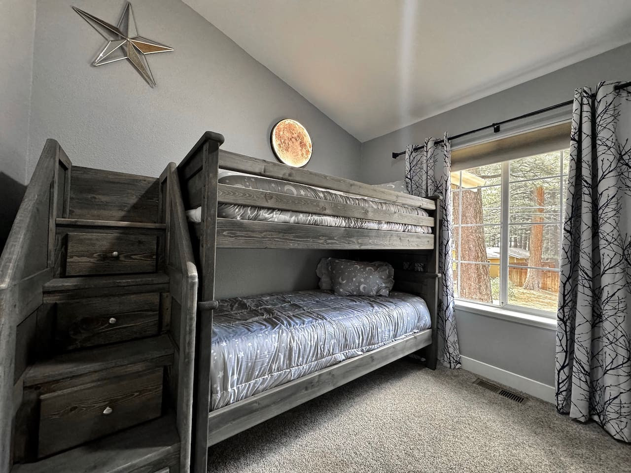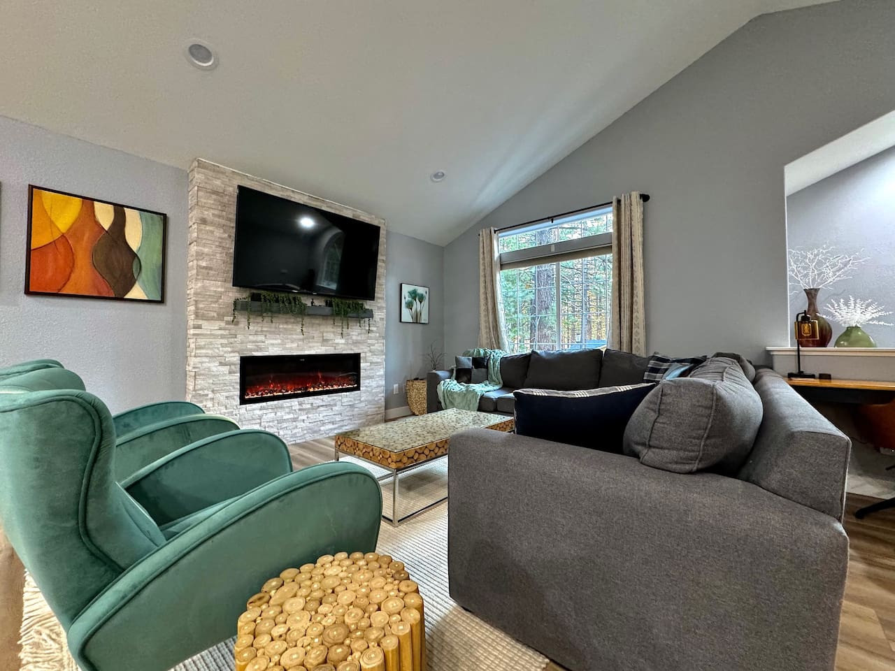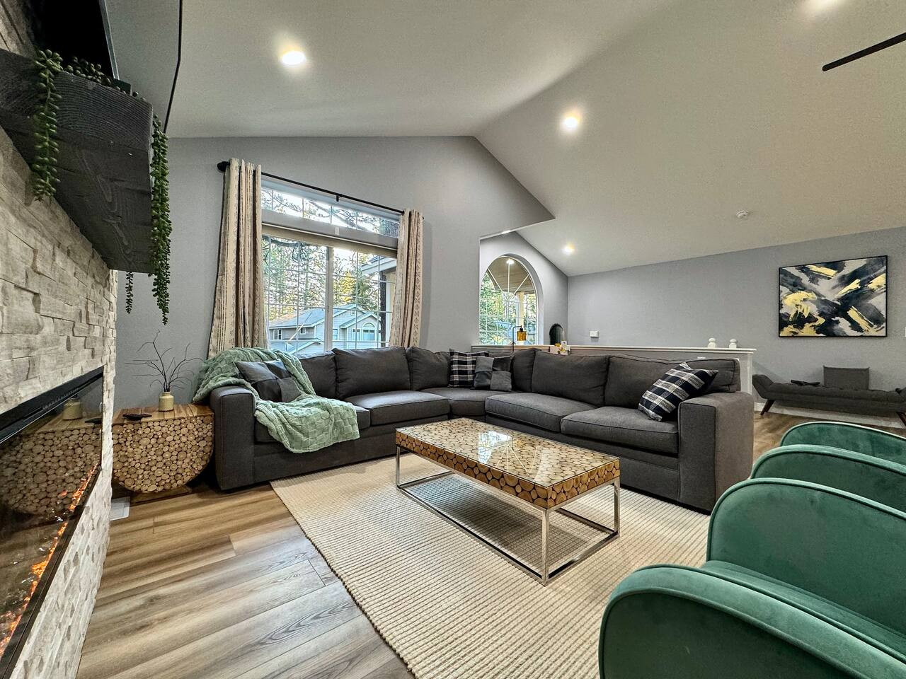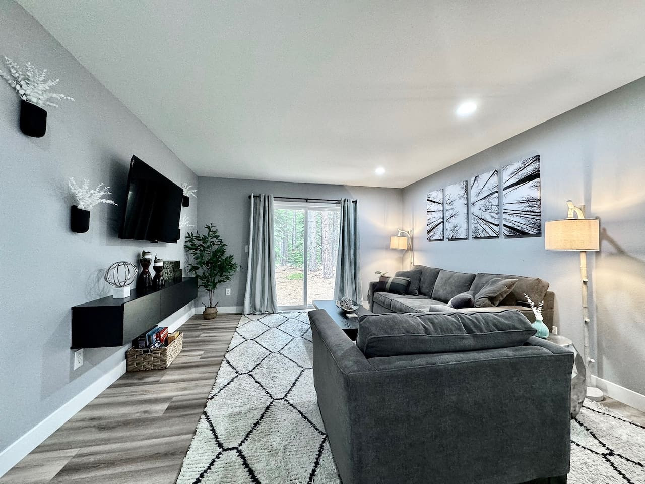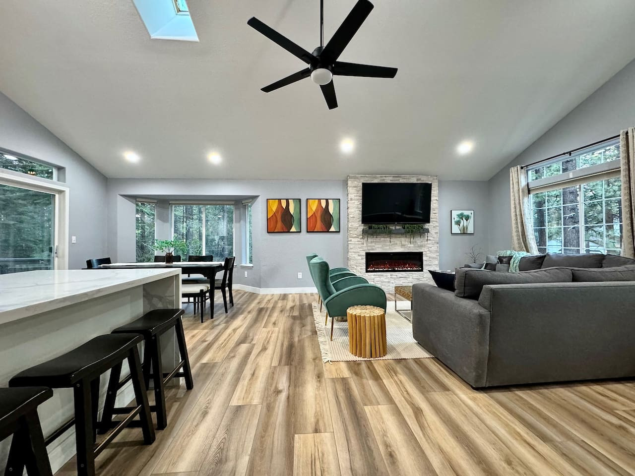 Updated 4BR/2BA in South Lake Tahoe. 2 gas fireplaces, arcade table (2,475 games), 5 Smart TVs. King master with private deck, bunk rooms for families. Granite kitchen, A/C, washer/dryer. Huge yard bordered by USFS land. Two decks, BBQ. 10 min to Hea...